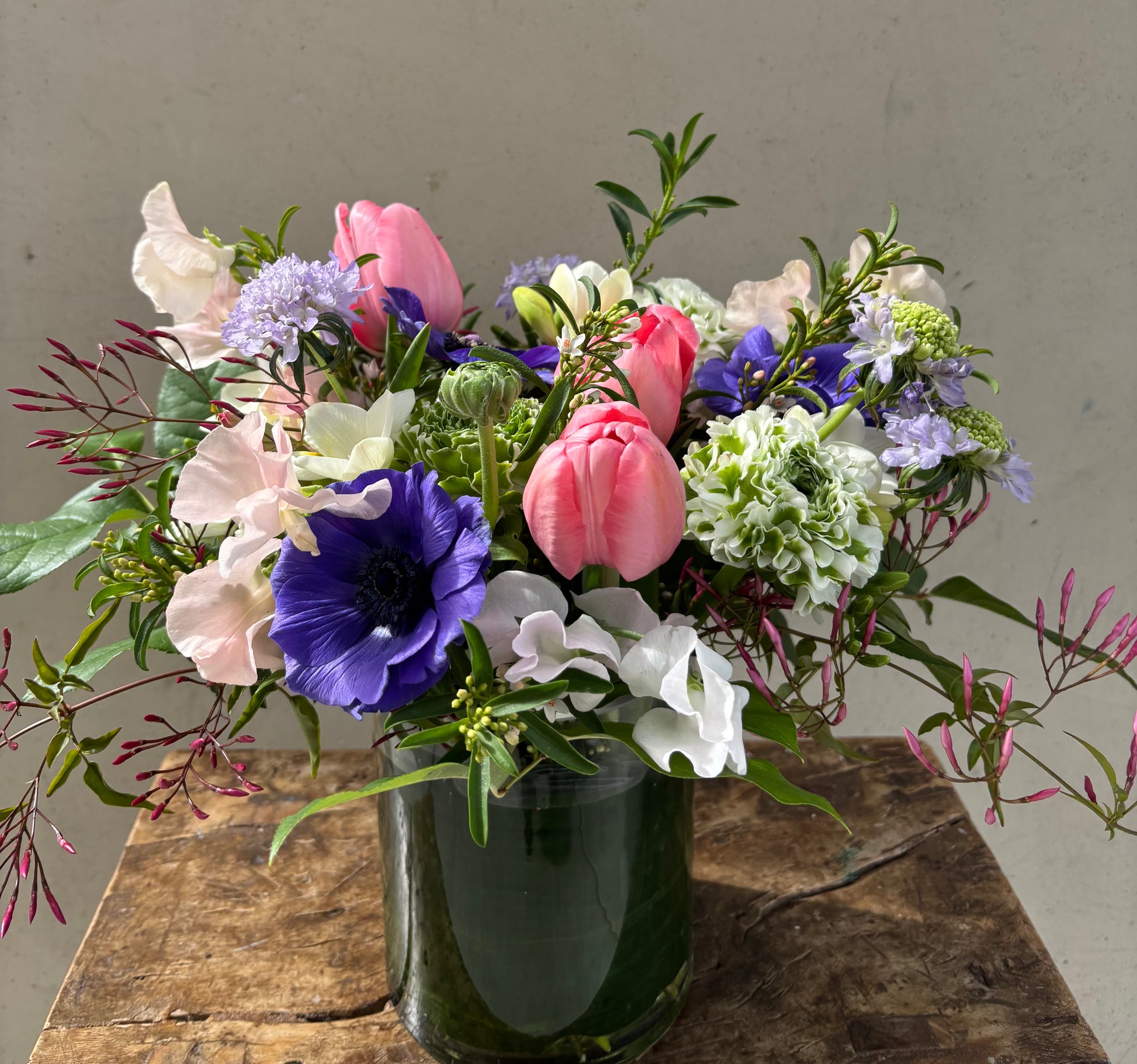 Our signature Springtime Reverie arrangement combines the soft blush of tulips, the graceful blooms of sweet peas, and the lively charm of poppies and anemone. With lush green foliage as the backdrop, these flowers form a symphony of cheerful spring hues. It's a refined and timeless design, perfect for adding a touch of class to any space.