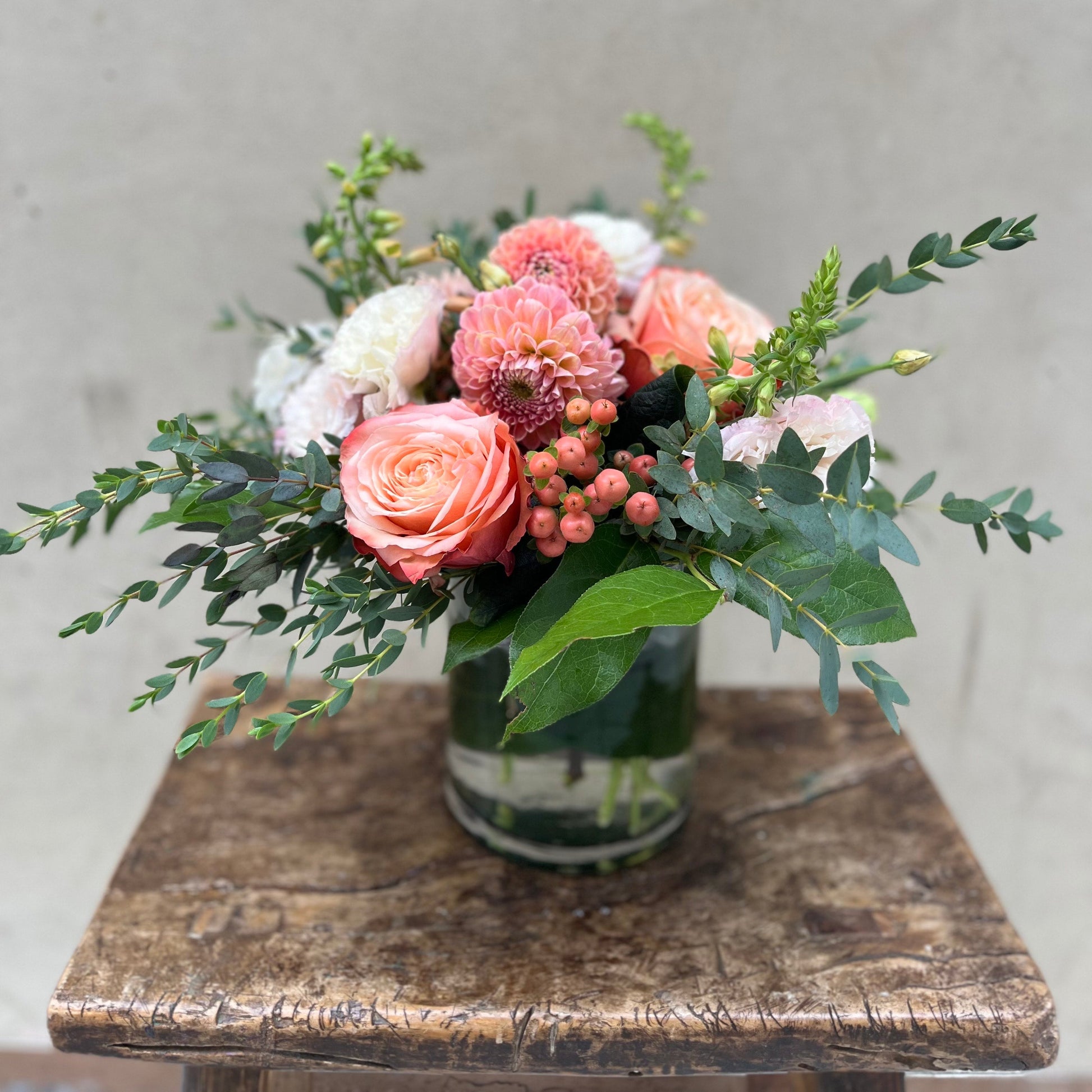 This playful design mixes peach toned roses, dahlias, and berries with silver toned eucalyptus. It's a refined and timeless design, perfect for adding a touch of class to any space.